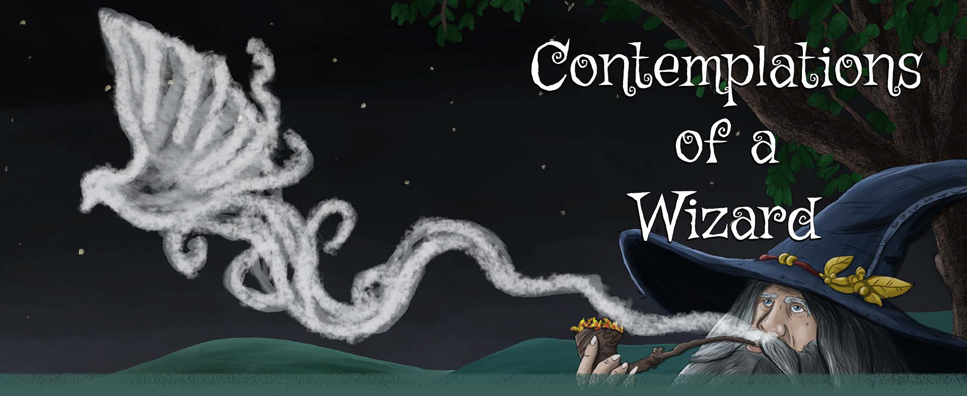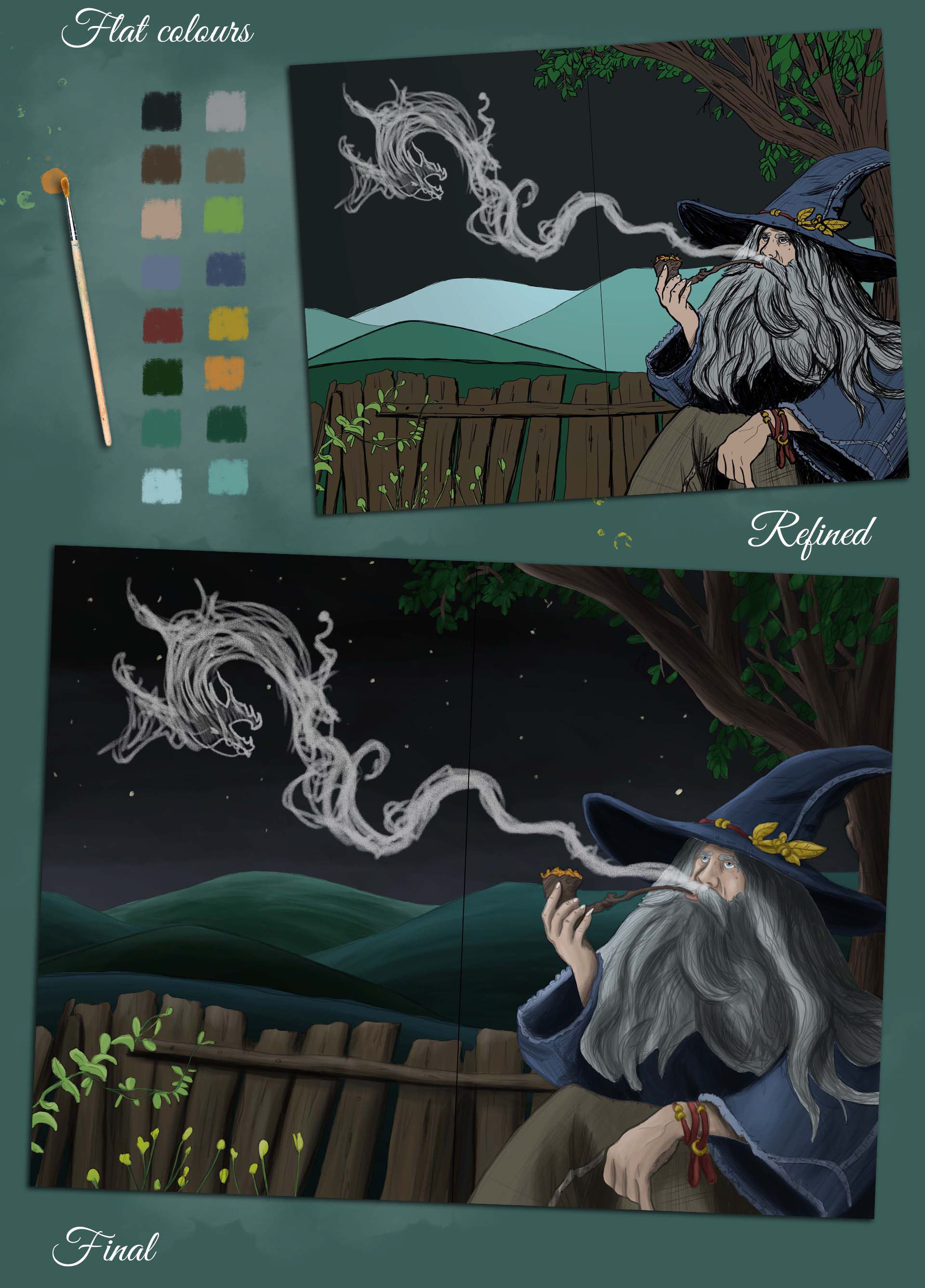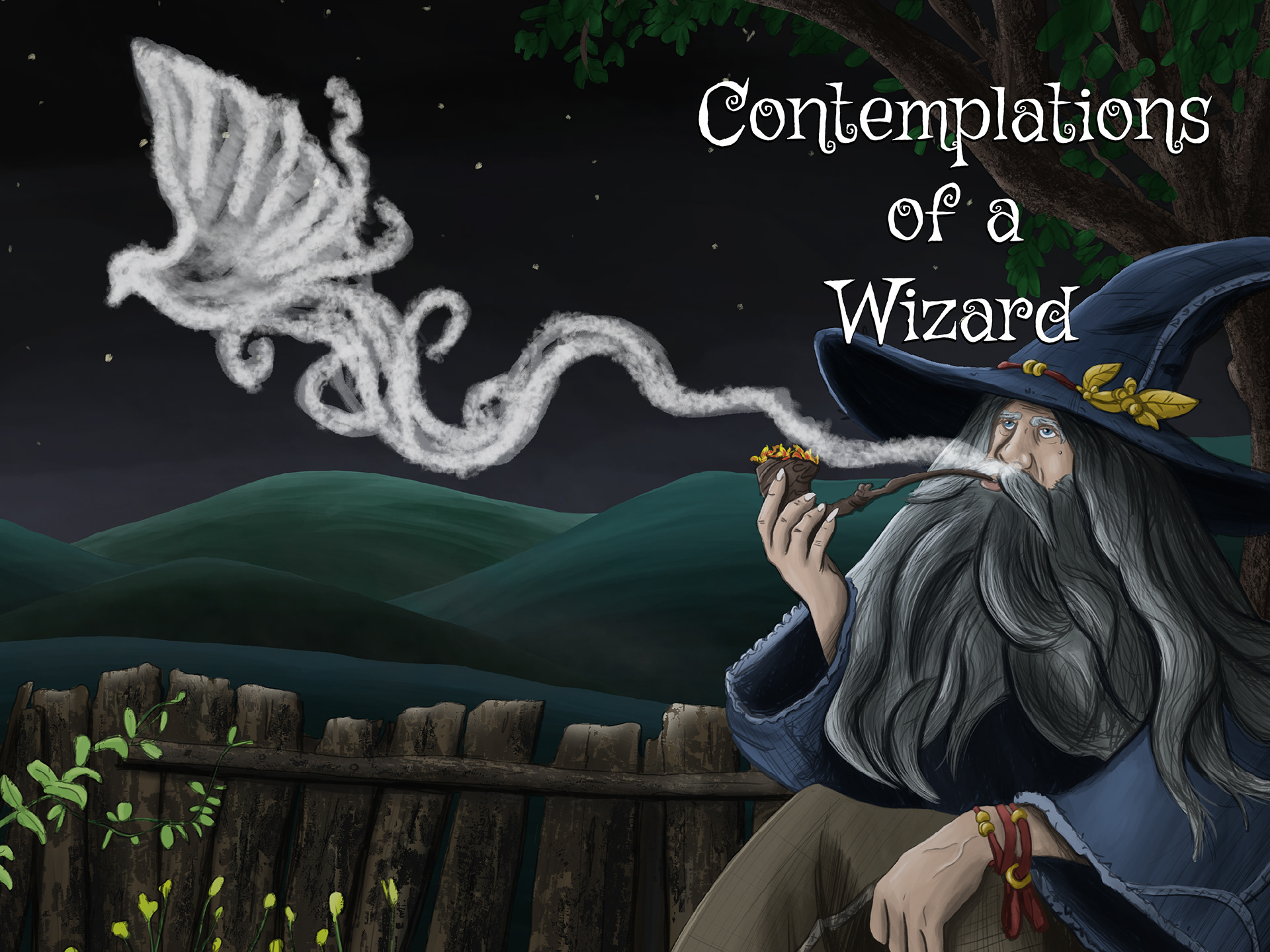 In this project I was contracted to illustrate a book cover of a wizard deep in thought, looking up to the stars and smoking a pipe. I wanted the illustration to look somewhat hand-sketched and use earthy colours to bring it all together.